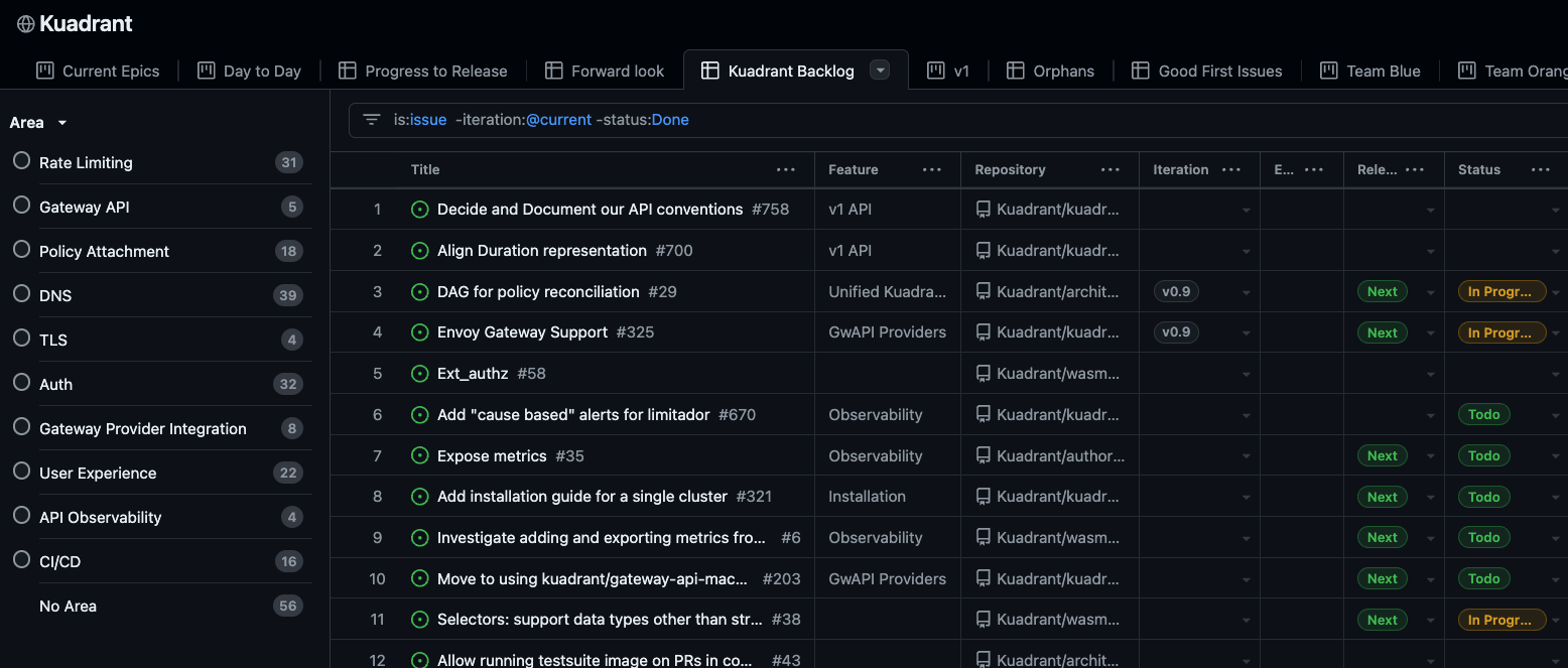 The Kuadrant Backlog gives us a sorted view of all backlog items across the different repositories, areas, and features. These terms are explained in detail below.
