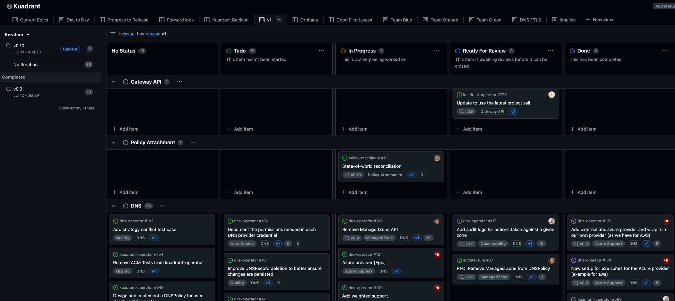 For releases, like the Kuadrant v1 milestone release, a board view, grouped by area is available.